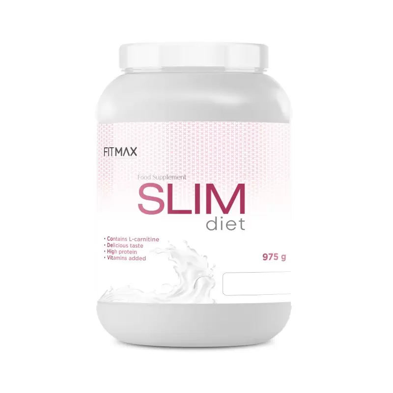 Maisto papildas. FITMAX Slim Diet – 975g . Šiame produkte yra angliavandenių, išrūgų baltymų koncentrato, inulino skaidulų, l – karnitino. Produkte yra reikalingų vitaminų ir mineralų.